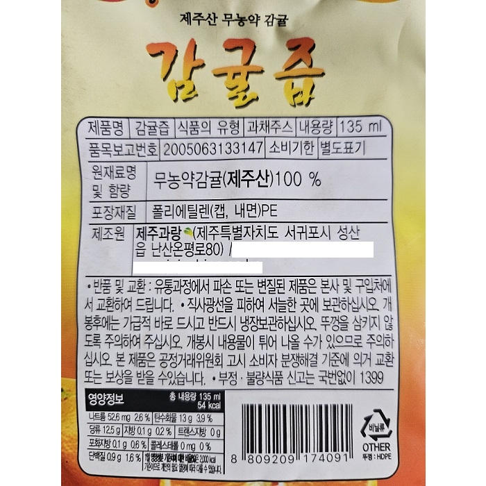 제주 100% 무농약 감귤즙 135ml 요약정보 및 구매